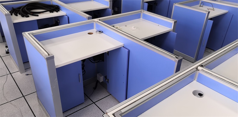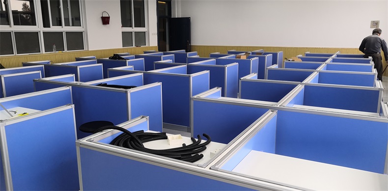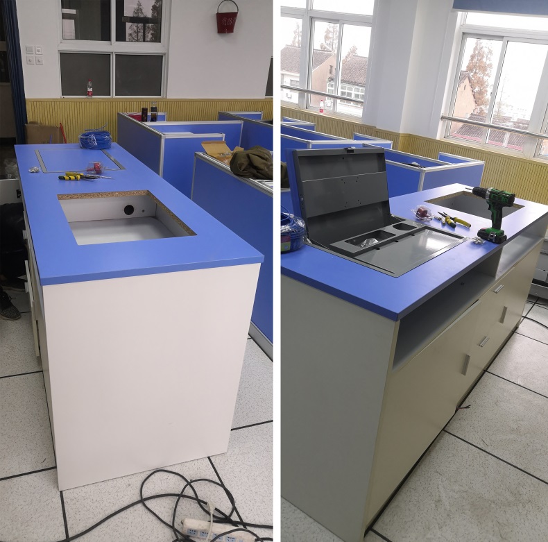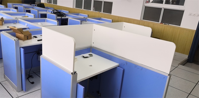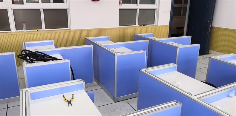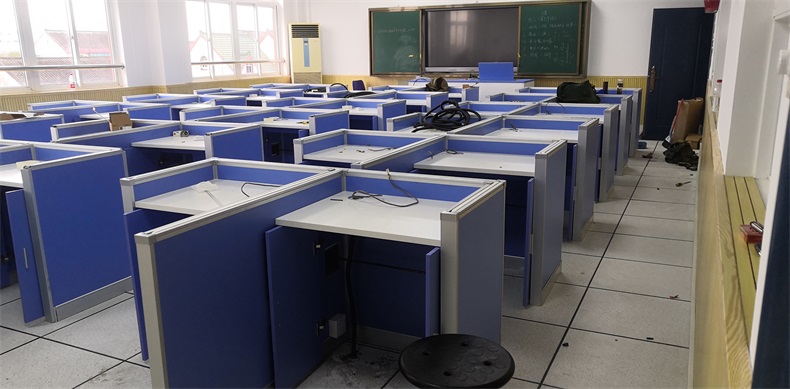根據上海市新農學校多媒體升降屏風教室使用需求,在產品設計方面,電腦桌的左、右、前三面帶升降屏風擋板,用于隔斷相鄰考生視線。當屏風升起時,可以用作教室計算機標準化考試使用,當屏風降下時,可以用于學生上課使用。實現了一室多用、考學合一。
