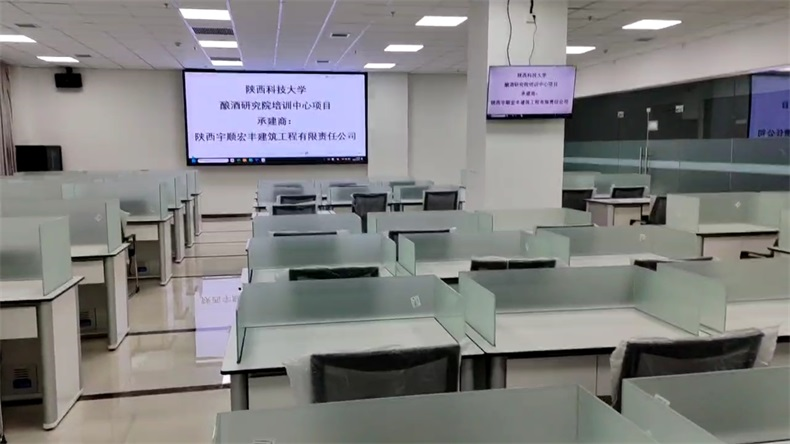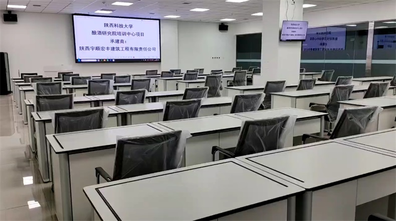 根據(jù)陜西科技大學(xué)對釀酒研究院培訓(xùn)中心的使用需求,方方智能對該語音室設(shè)計了一套可以升降的智能升降屏風(fēng)桌,每個座位都有可升降的屏風(fēng),考試時屏風(fēng)升起后可有效的隔斷相鄰人的正常視線,防噪音效果,可達(dá)到互不干擾的作用,當(dāng)屏風(fēng)降下時,桌面齊平可以用于學(xué)生日常上課使用。實現(xiàn)了一室多用、考學(xué)合一。