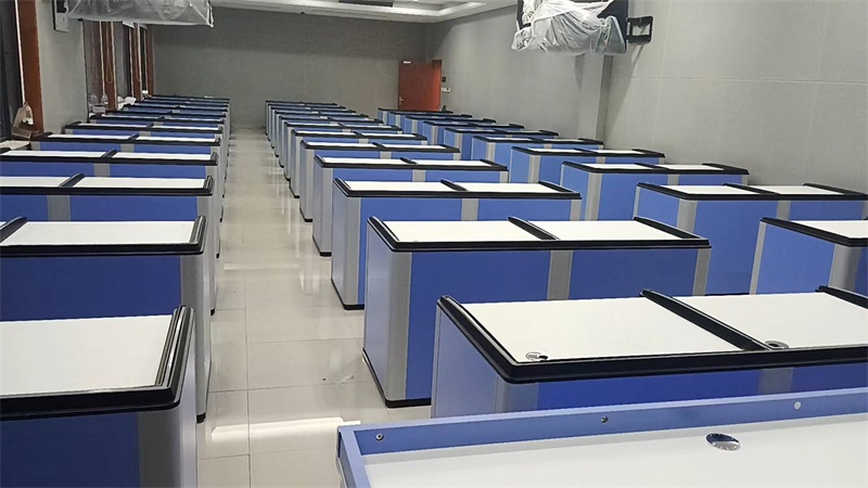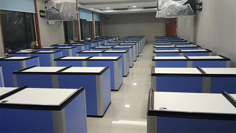 根據國網湖南技培中心職業培訓室的使用需求,方方智能對該培訓室設計了一套可以升降的智能升降屏風桌,每個座位都有可升降的屏風,考試時屏風升起后可有效的隔斷相鄰人的正常視線,防噪音效果,可達到互不干擾的作用,當屏風降下時,可以用于職員日常培訓上課使用。實現了一室多用、考學合一。