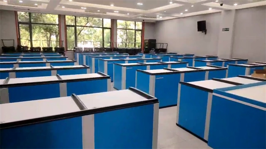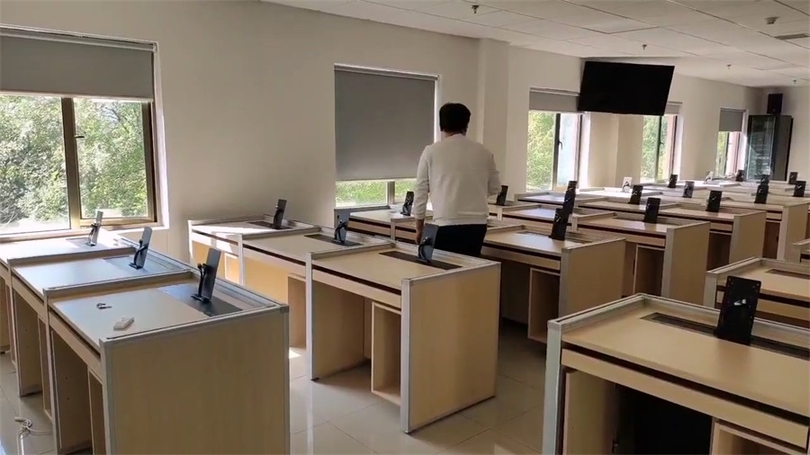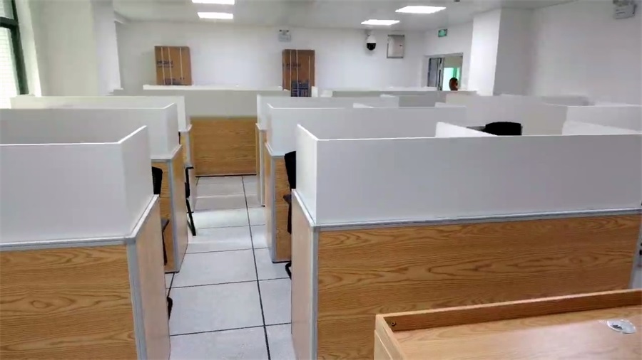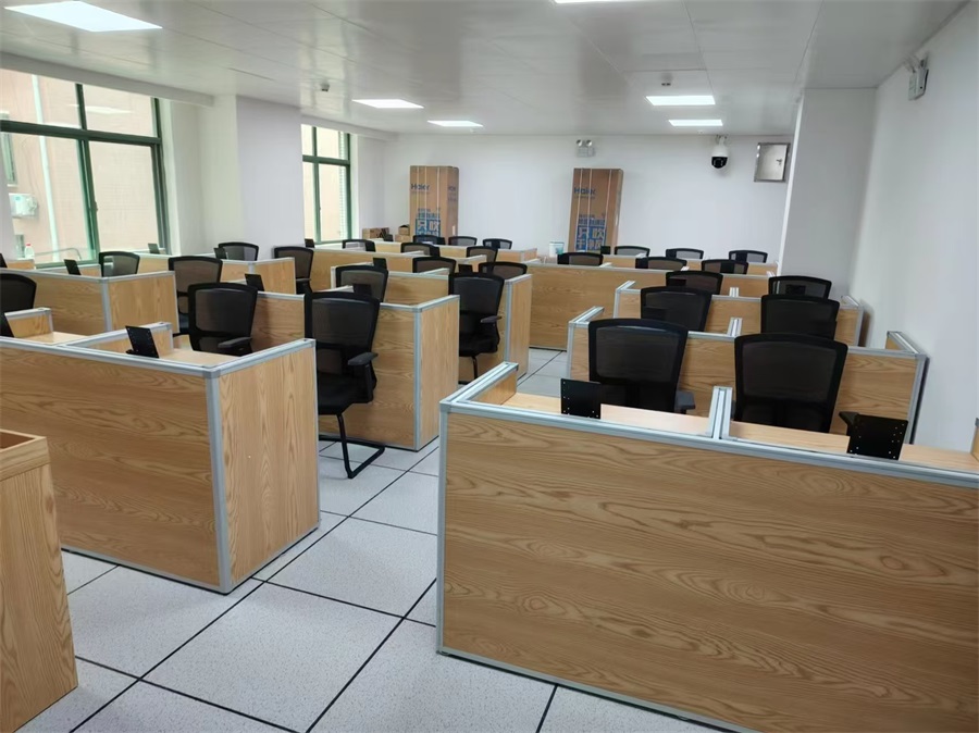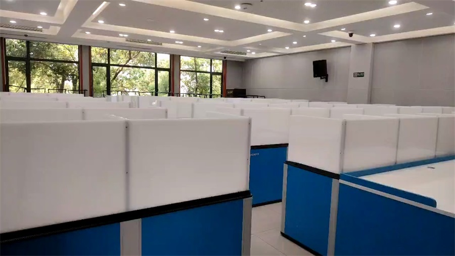 湖南技培中心12號樓網(wǎng)絡(luò)教室采用方方智能博學(xué)款升降屏風(fēng)桌,根據(jù)現(xiàn)場場地布局分別設(shè)計了三人位和雙人位升降屏風(fēng)桌(三人位L2370*H780*D690,雙人位:L1600*H780*D690 ),基礎(chǔ)高度780mm、桌面高750mm、深度690mm,屏風(fēng)考試時升起高度需達(dá)到1260mm ,屏風(fēng)升降板采用單面奶白色8mm亞克力板,隔音效果更好,屏風(fēng)升降口為ABS材質(zhì),大型模具注塑成型,左右兩邊為一體成形,保證升降口美觀精密,更美觀。形成獨(dú)立隔音空間,有效減少相鄰學(xué)員的干擾。可根據(jù)使用場景,一鍵升降屏風(fēng)升降板。一教室多用的需求。