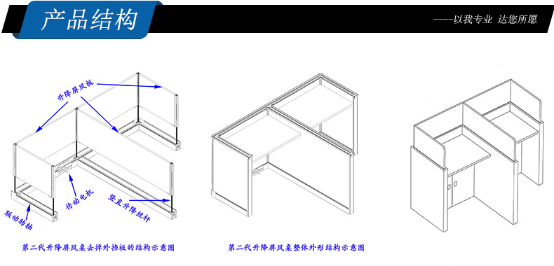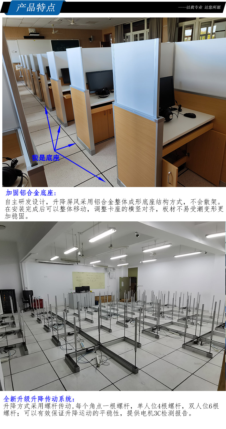 4、*升降屏風采用一體成形鋁合金型材整體包邊,升降底座固定架采用84*68*1.5mm雙層鋁合金底座安裝完成可整體移動,調整卡座的橫豎對齊,板材不易受潮變形更加穩固;桌體采用鋁材插接方式連接,所有外表不漏螺絲釘或尖銳五金件,確保使用身體不被劃傷。